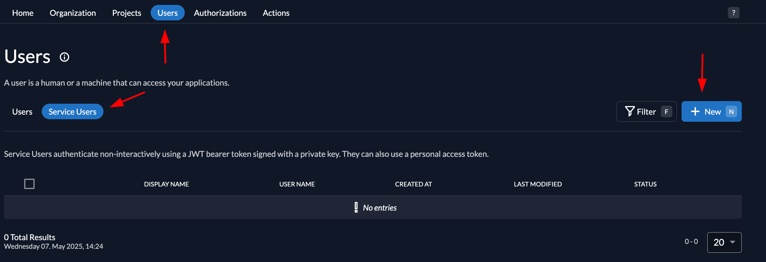 Give the service user a name and a user name. Select Bearer as Access Token Type.