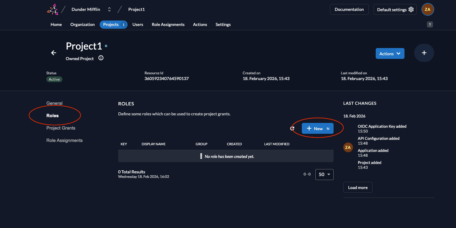 - Go to your project and select Roles. Click New.