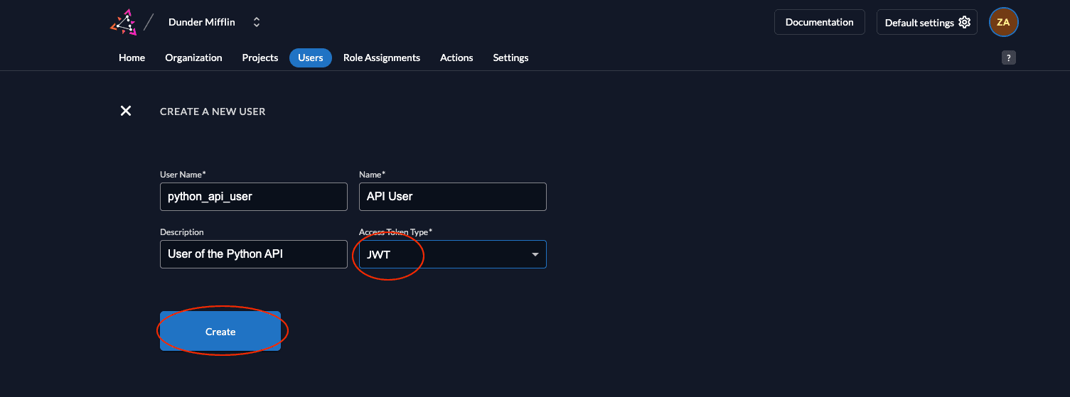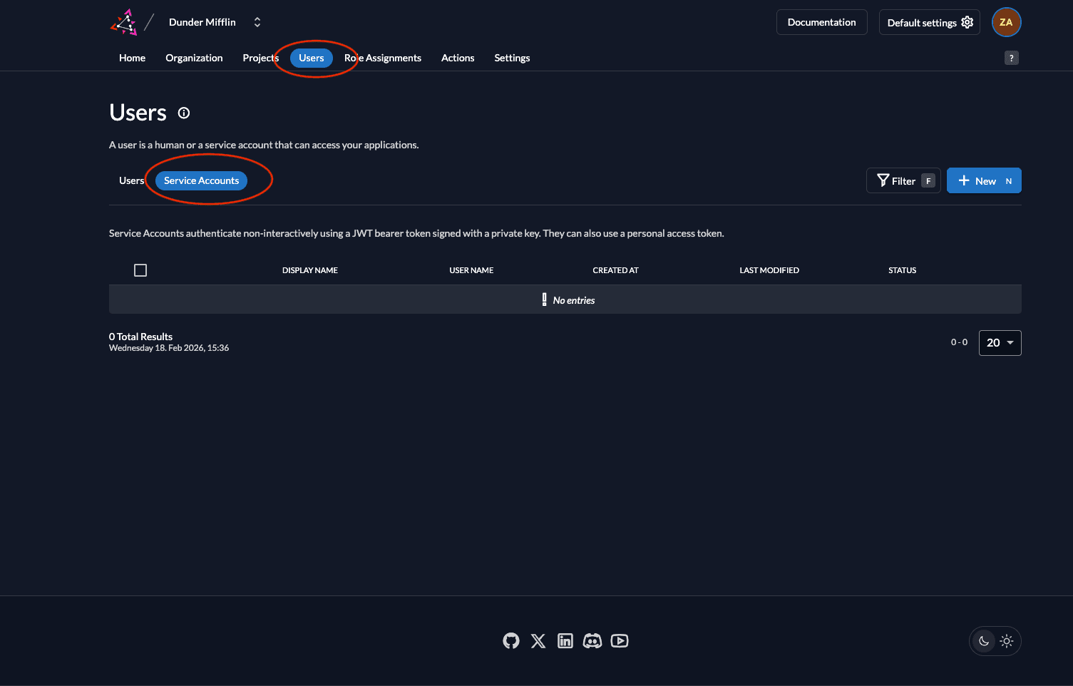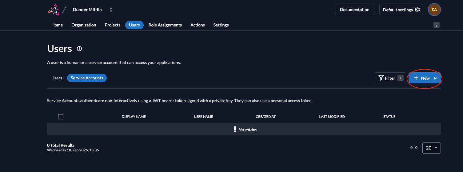 - Go to the Users tab in your organization as shown below and click on the Service Accounts tab.
