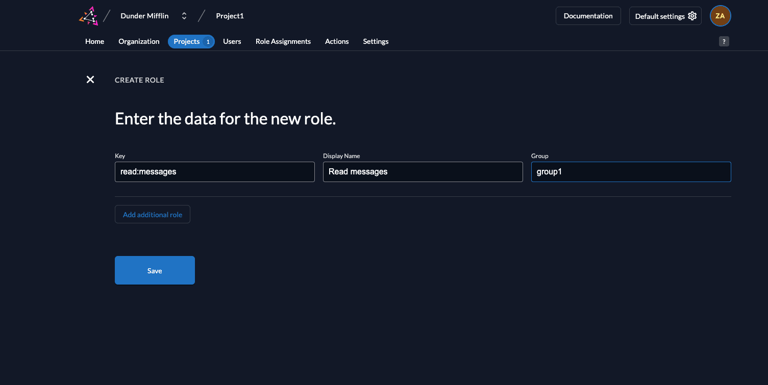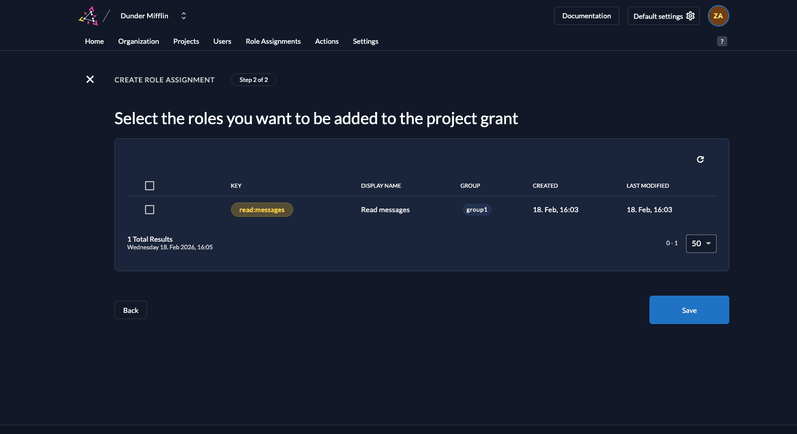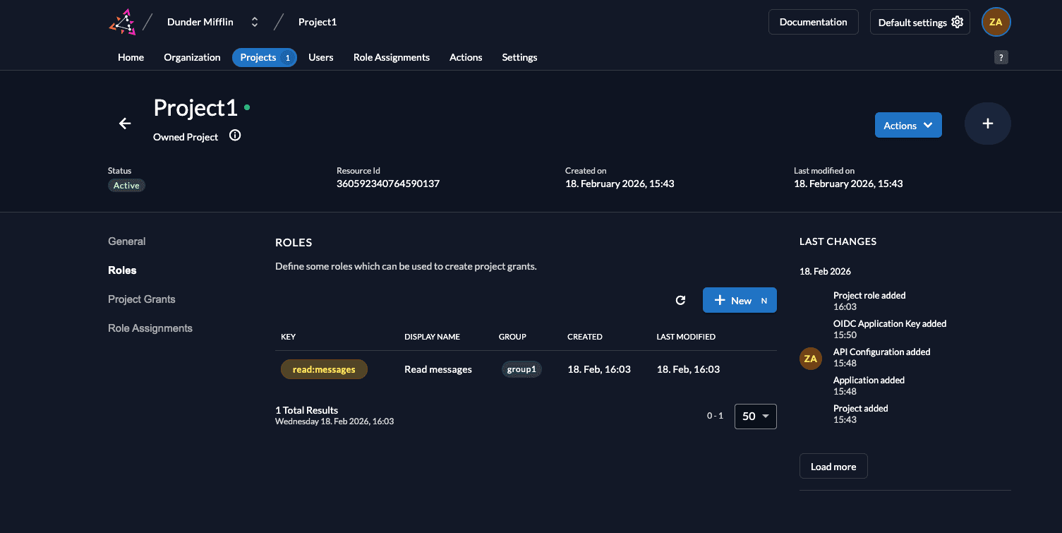 In order to access this route, you must create the role read:messages in your ZITADEL project and also assign a role to the service account you created by adding the role to the user. Follow these steps to do so: