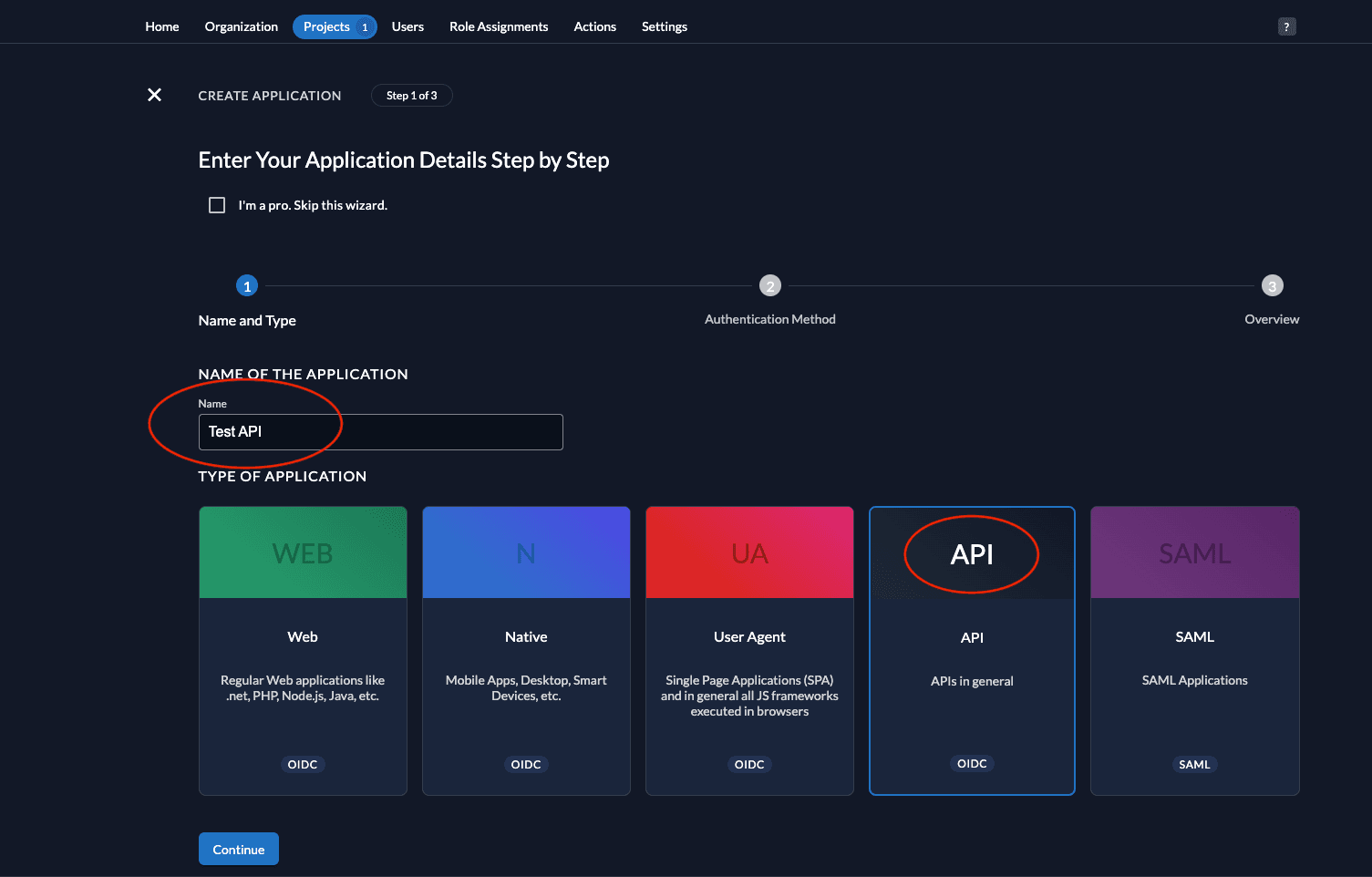 - Give a name to your application (Test API is the name given below) and select type API.