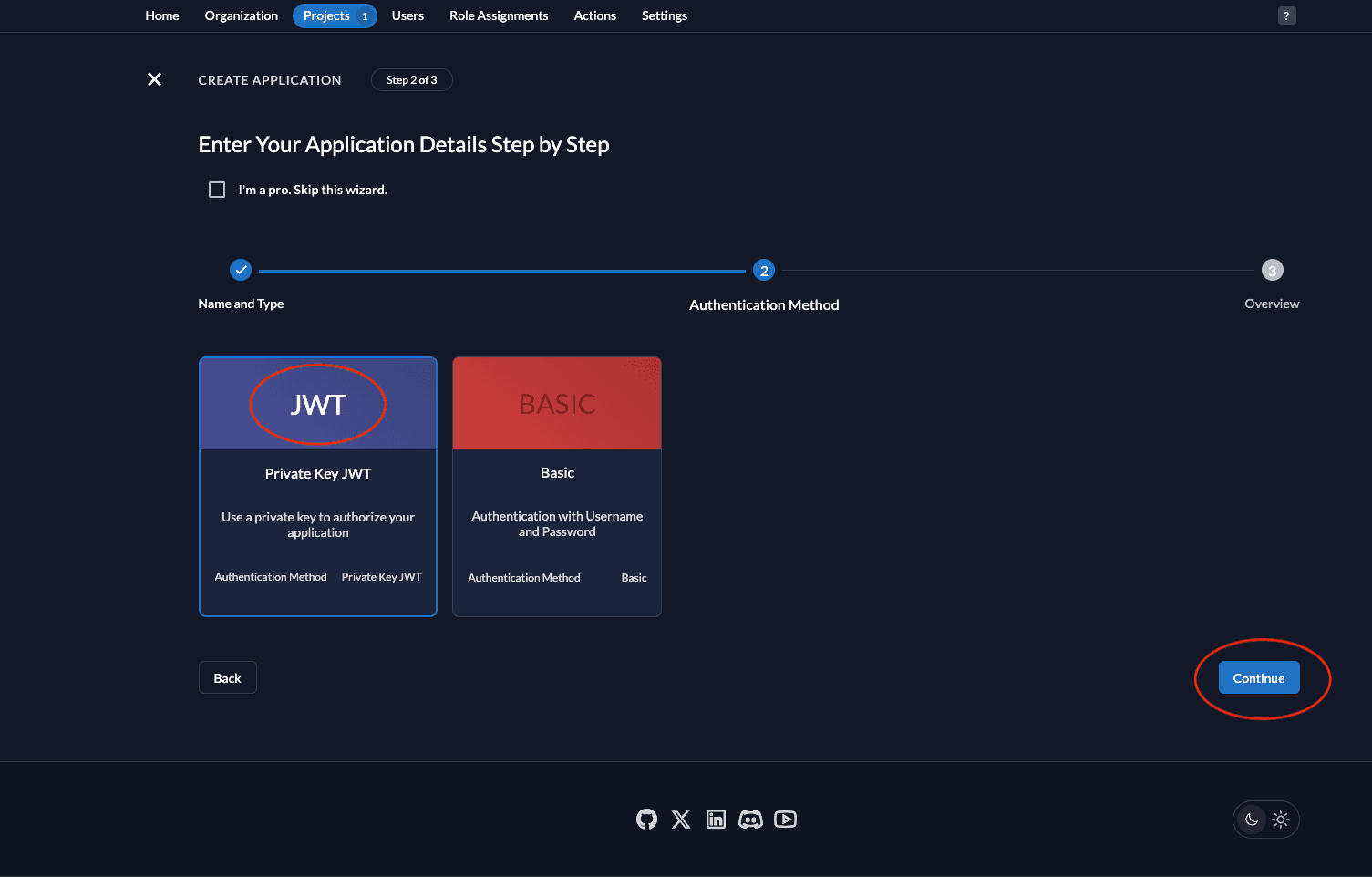 - Select JWT as the authentication method and click Continue.