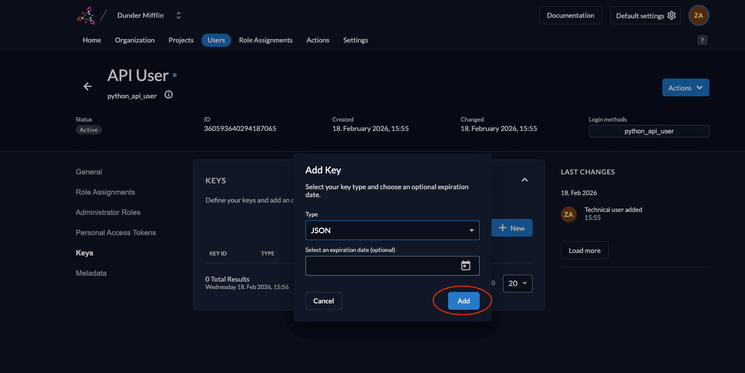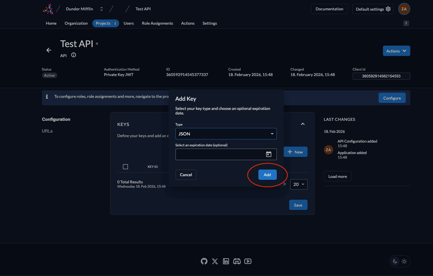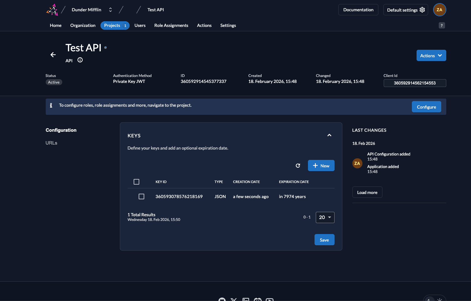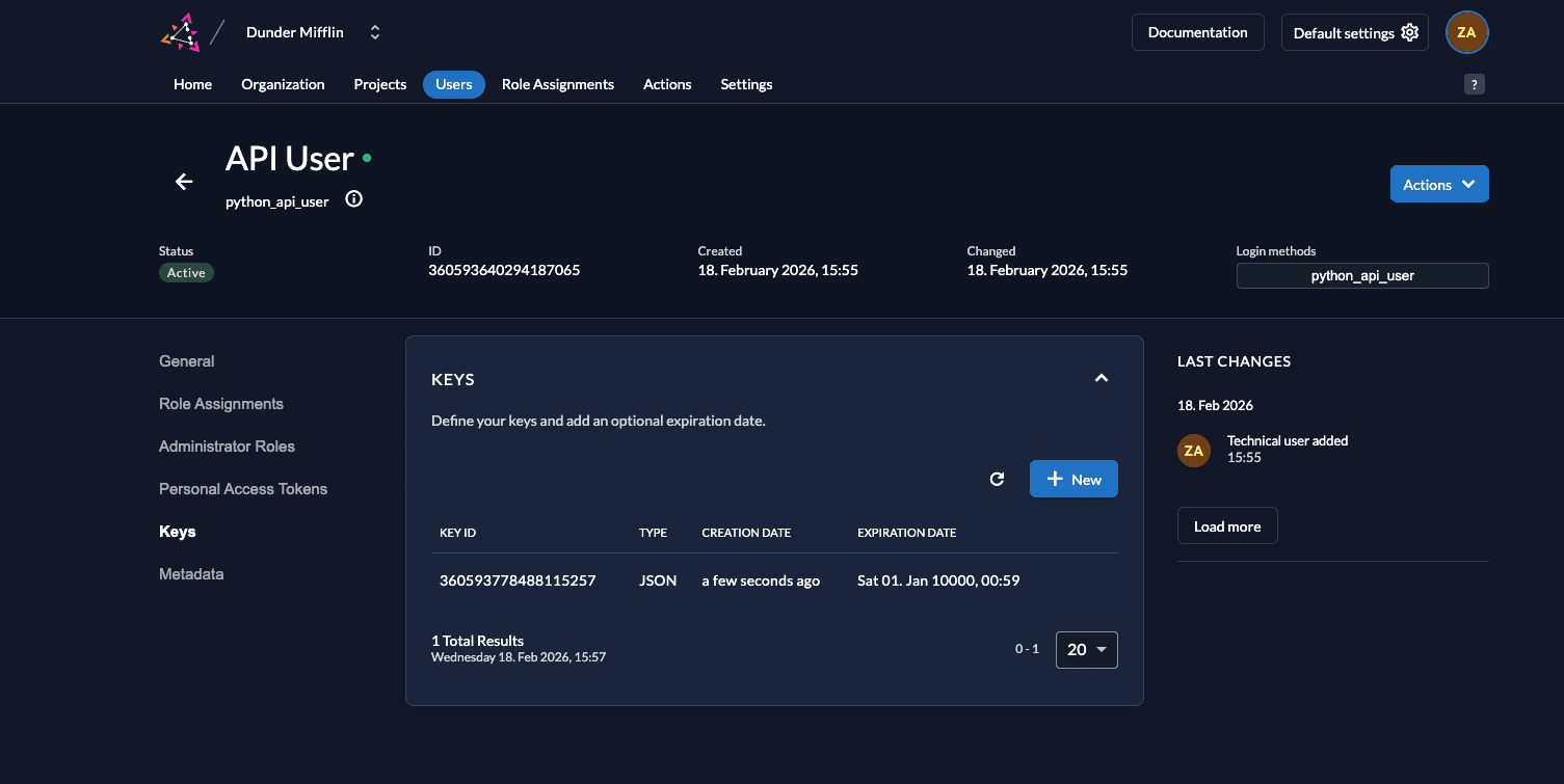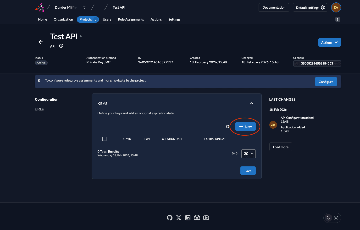 - Next, we need to generate a private-public key pair in ZITADEL and you must get the private key to sign your JWT. Go to Keys and click on New.