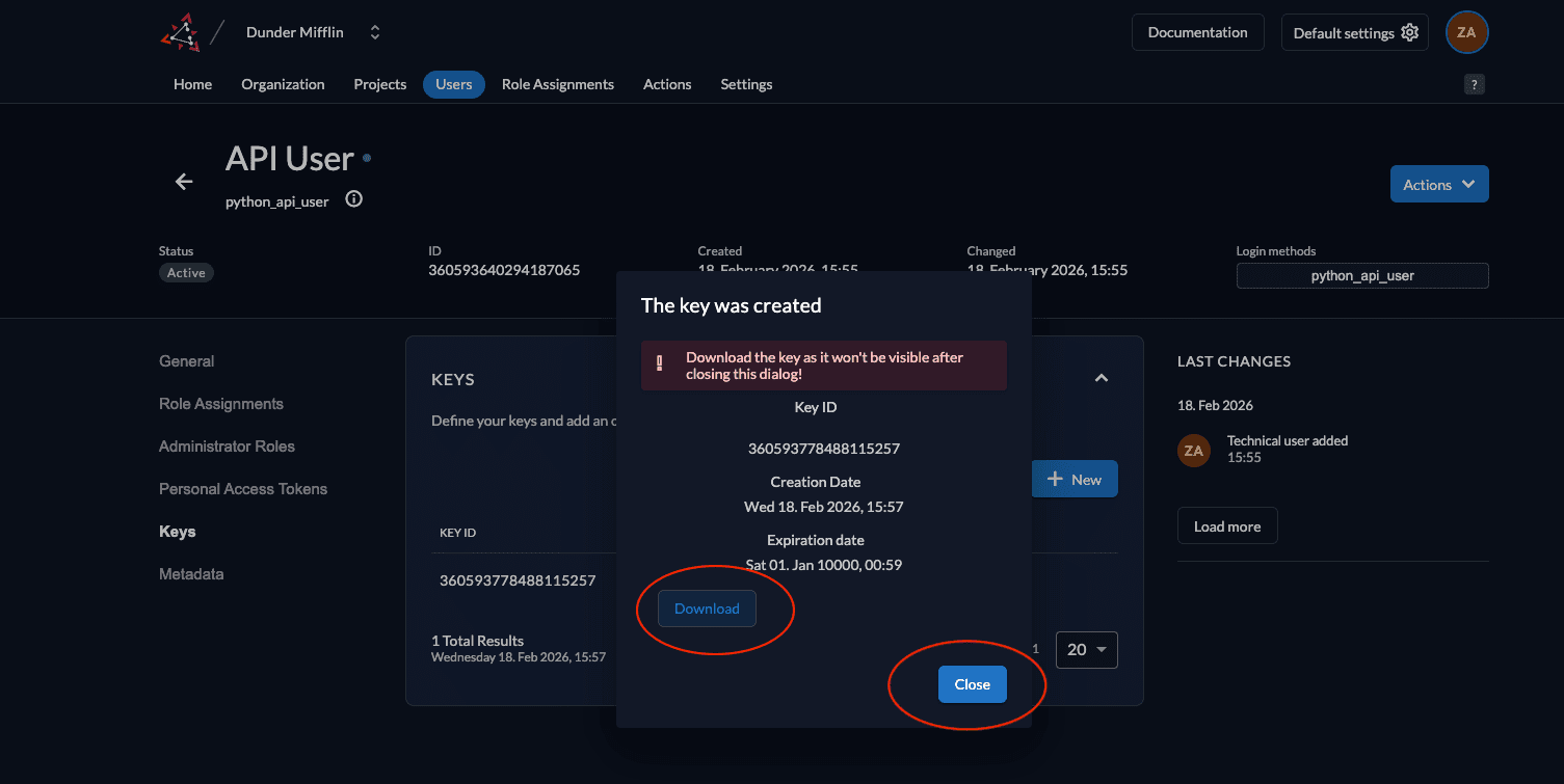 - Download the created key by clicking the Download button and then click Close.
