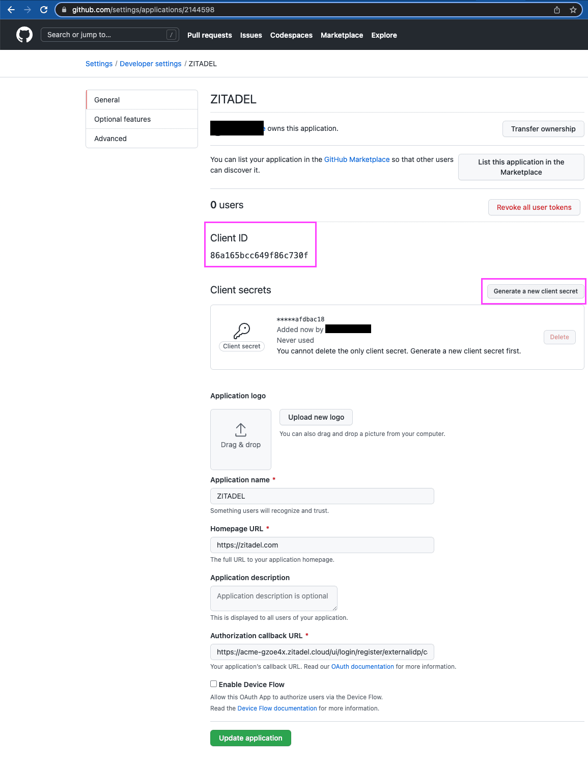 - Fill in the application name and homepage URL.