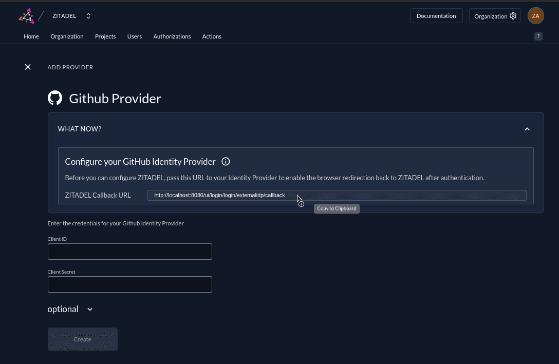 Click on the ZITADEL Callback URL to copy it to your clipboard. You will have to paste it to the GitHub OAuth application later.