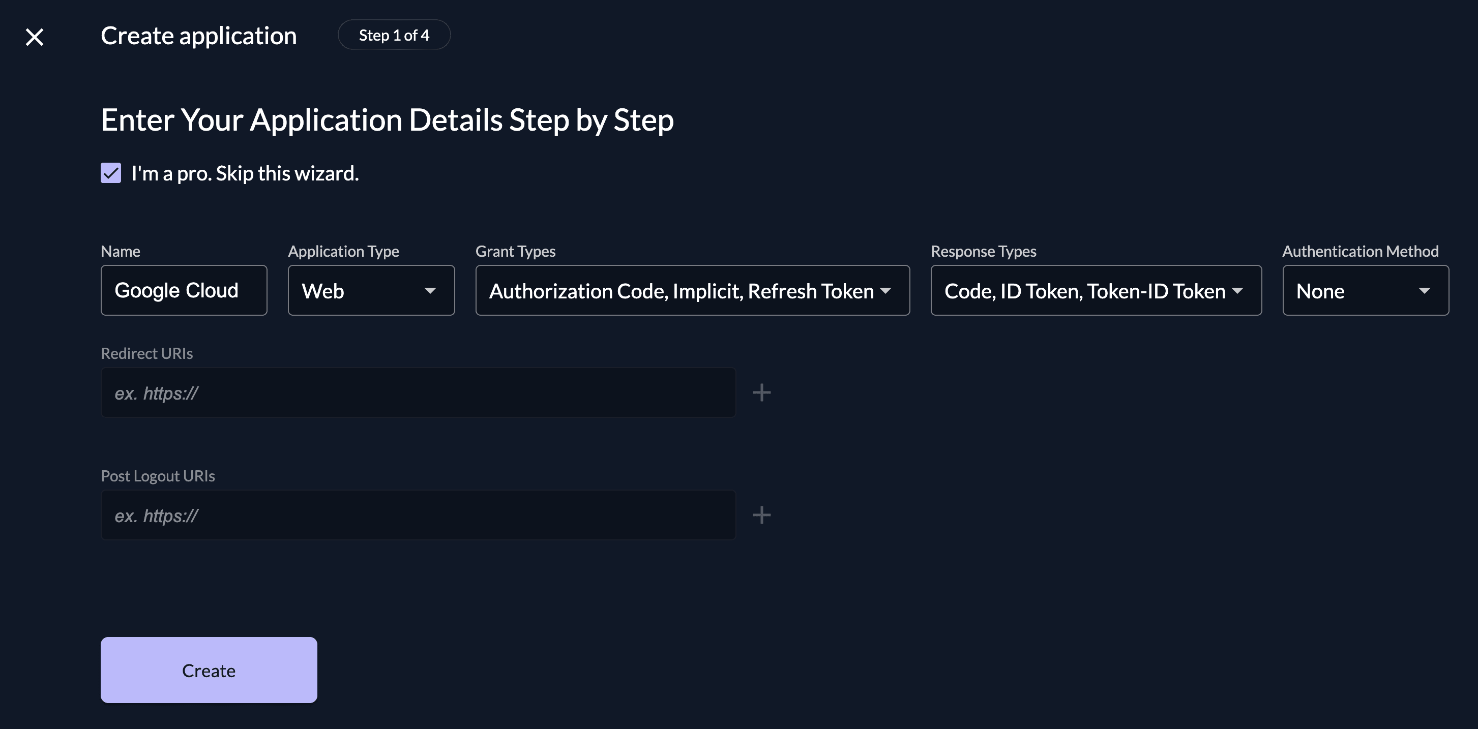Create a new application and click on "I'm a pro. Skip this wizard."