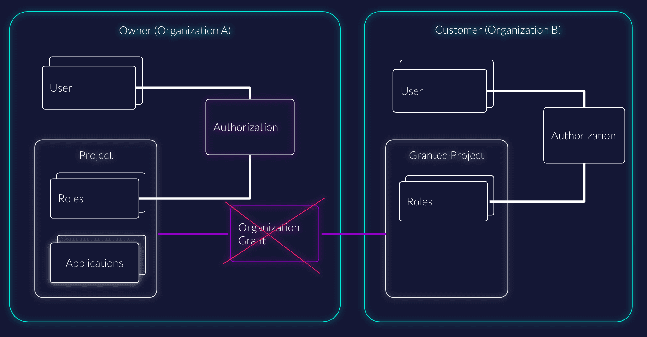 You do have two organizations, an owner (Organization A) and a customer (Organization B). The Organization A owns a Project, and has to grant it to Organization B, so users are allowed to authenticate. The error message is shown to users of Organization B that the permission is required, but the project is not granted to Organization B.